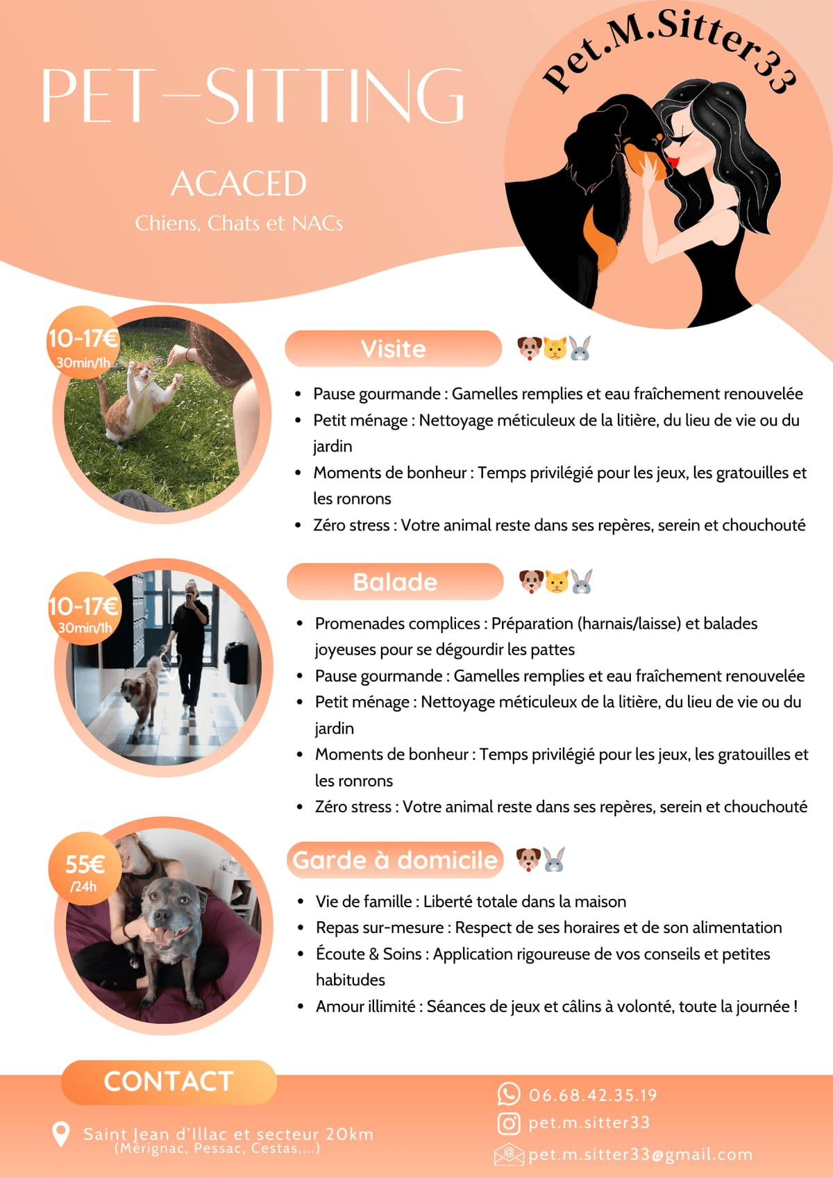 Vous prévoyez une escapade, un week-end ou une grosse journée de travail ? Je m'appelle Margaux et avec Pet.M.Sitter33, je mets tout mon cœur et mon savoir-faire au service de vos compagnons. Que ce soit pour une balade pour se dégourdir les pattes, une visite à domicile pour les câlins et les repas, ou une présence rassurante jour et nuit, je m'adapte aux besoins de chacun. 📍 Où ça ? Secteur : Saint Jean d’Illac et dans un rayon de 20km (Mérignac, Pessac, Cestas...). Le petit plus qui change tout : Je suis une professionnelle déclarée et titulaire de l'ACACED. Confier ses animaux à un professionnel diplômé, c’est s’offrir la garantie d’un départ serein et la certitude que leur sécurité et leur bien-être restent la priorité, quoi qu'il arrive. Découvrez mon univers en images juste ici ! 👇 - 📸 Mon quotidien sur Insta : https://www.instagram.com/pet.m.sitter33/ - 🗓️ Infos & Réservations : https://www.petmsitter33.fr/ ou https://web.kookie.pet/web/9be2e0316e-petmsitter33/sitter - ⭐ Ce qu'en disent les clients : https://share.google/RfDIUhp2GC1iocoXk 📱 06.68.42.35.19 📧 pet.m.sitter33@gmail.com