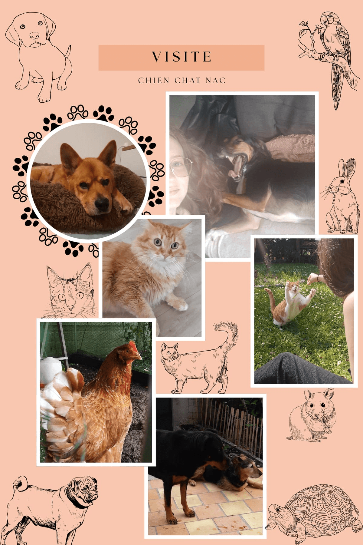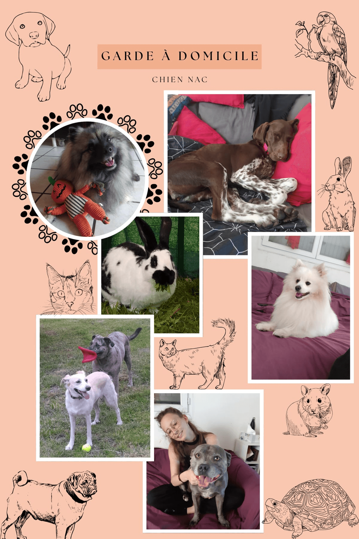 🏠 Garde à domicile (Chiens & NAC) Le cocon d'une famille, la chaleur d'un foyer : ici, c'est "comme à la maison", l'amour en plus et les box en moins ! ✨ Votre petit protégé ne va pas en pension, il part en vacances dans une vraie famille ! 🏠 Repas sur-mesure : Respect de ses horaires et de son alimentation habituelle Écoute & Soins : Application de vos conseils et petites habitudes Amour illimité : Séances de jeux et câlins à volonté ! Un accueil chaleureux réservé aux chiens et aux NAC